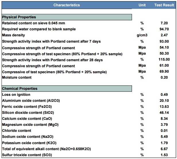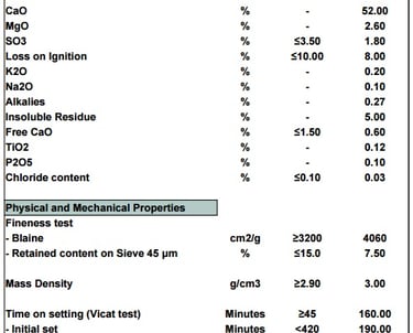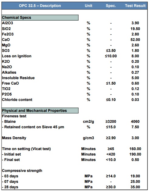 Test Results for Grades 42.5 and 52.5 shall be provided on request